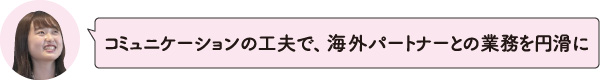 女性社員が働きやすく、スキルアップの機会に恵まれているところが同社の魅力。国際部は7人のメンバーが在籍し、2人が産休・育休を取っているそうです。メンバーの過半数が女性社員で年齢・性別・社会歴も様々。チームワークが良く、助け合いながら仕事を分担しています。また、国際部は業務が多岐にわたる部署なので、成長できる機会に恵まれています。セミナー制度があり、新入社員も安心して働き、スキルアップできる環境です。