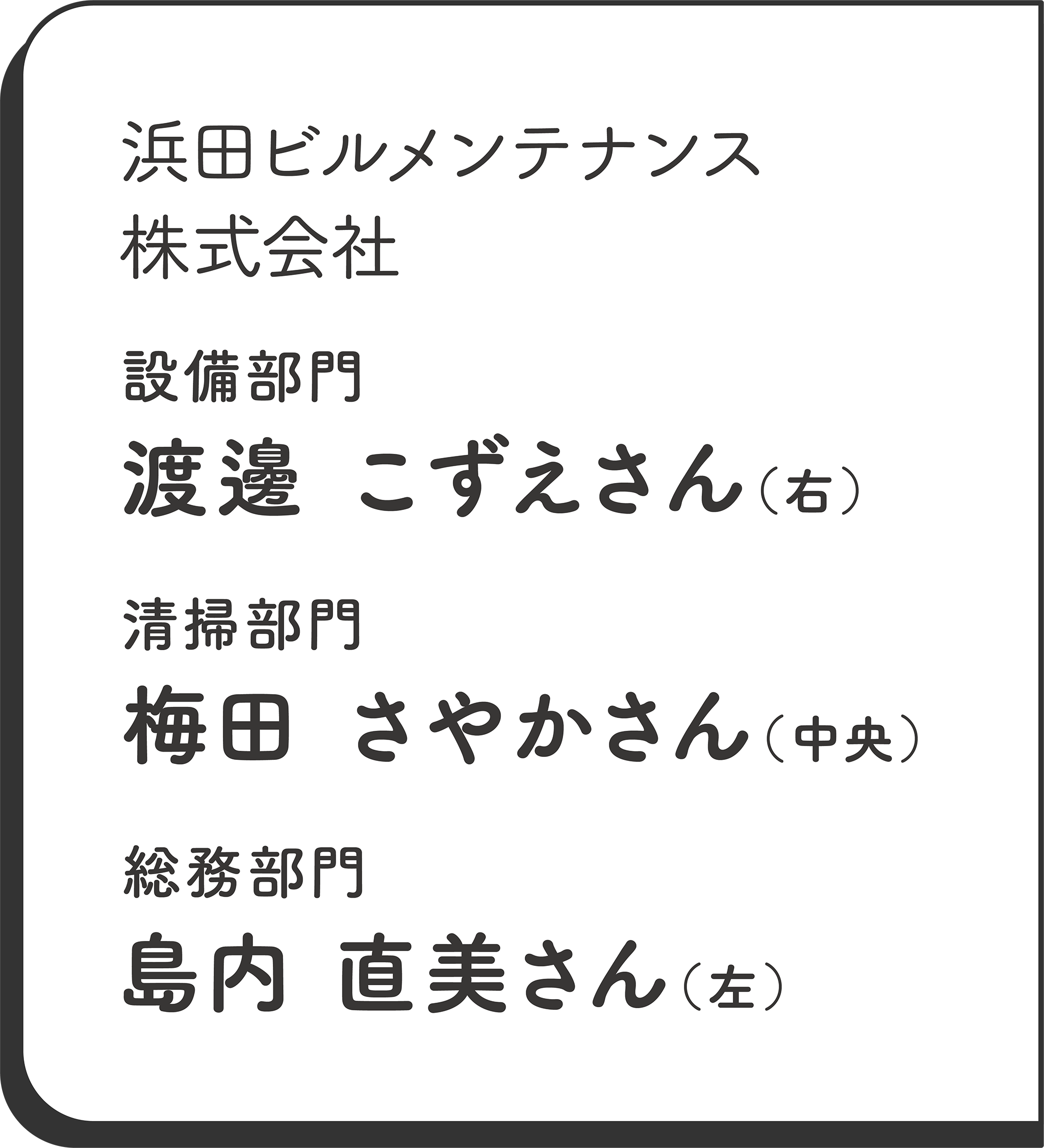 今回、取材をする中で一貫して感じたのは、浜田ビルメンテナンスで働く人の魅力です。島内さんの「業務に関係なくみんなが「ほかの人のために何かしたい!』という気持ちを持っていて、その“何か”を一緒になって考えられる場」という言葉を実感しました。今回の取材のためにも社員さんが一丸となって準備してくださいました!このような人たちと一緒に働ける環境は素敵だなと思いました。